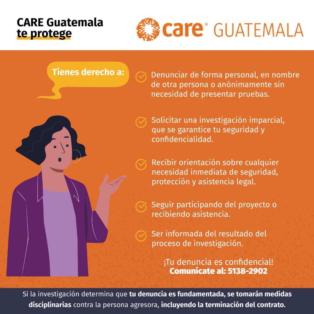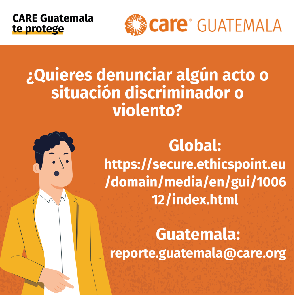 CARE se compromete a prevenir, detectar y corregir el fraude, la apropiación indebida, la discriminación, el acoso sexual, la explotación, el abuso y el abuso infantil, el apoyo al terrorismo y otras conductas ilícitas. Queremos saber si usted sospecha, o ha observado o experimentado, una conducta ilícita. Cuanto antes descubramos que algo va mal en nuestra organización, antes podremos hacer algo al respecto. Le animamos a compartir cualquier inquietud que pueda tener.